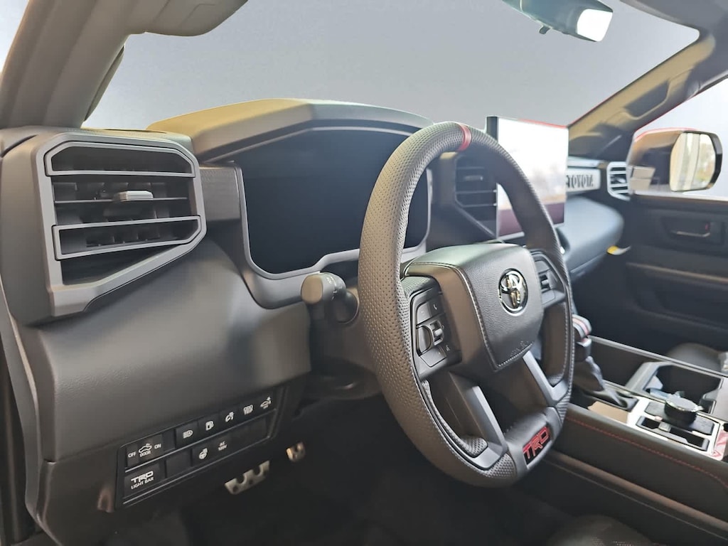 • TRD leather-wrapped manual tilt/telescopic steering wheel with TRD badge, red center stripe, and phone, audio, display/infotainment, and Driver Assist controls